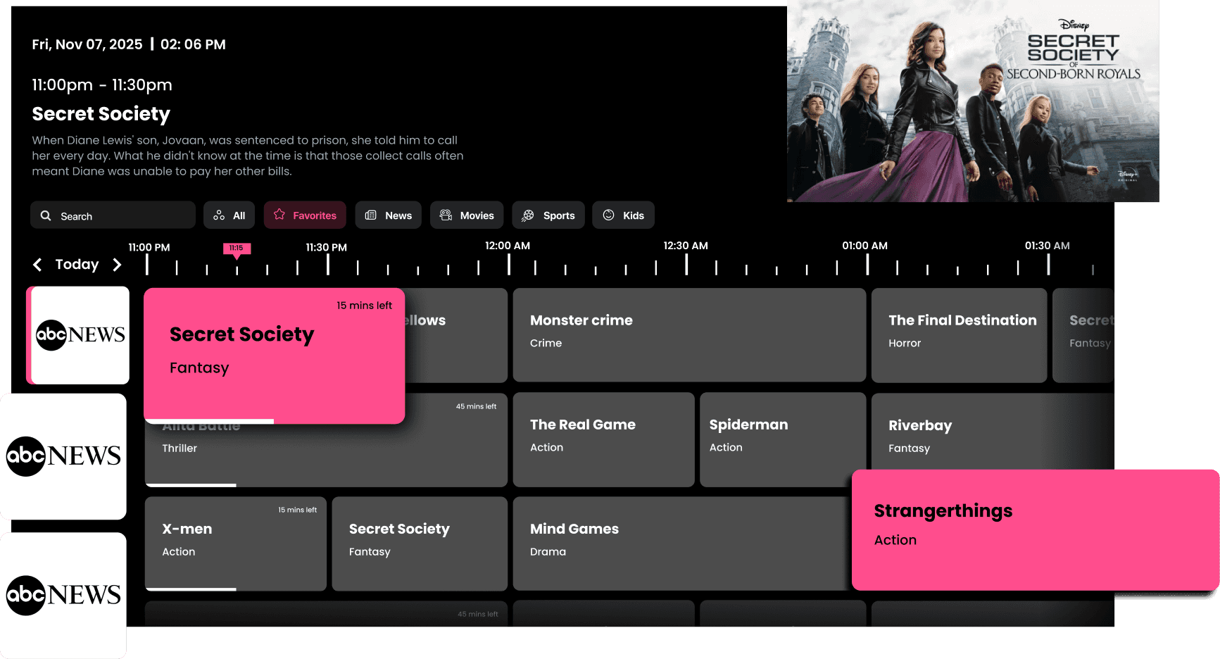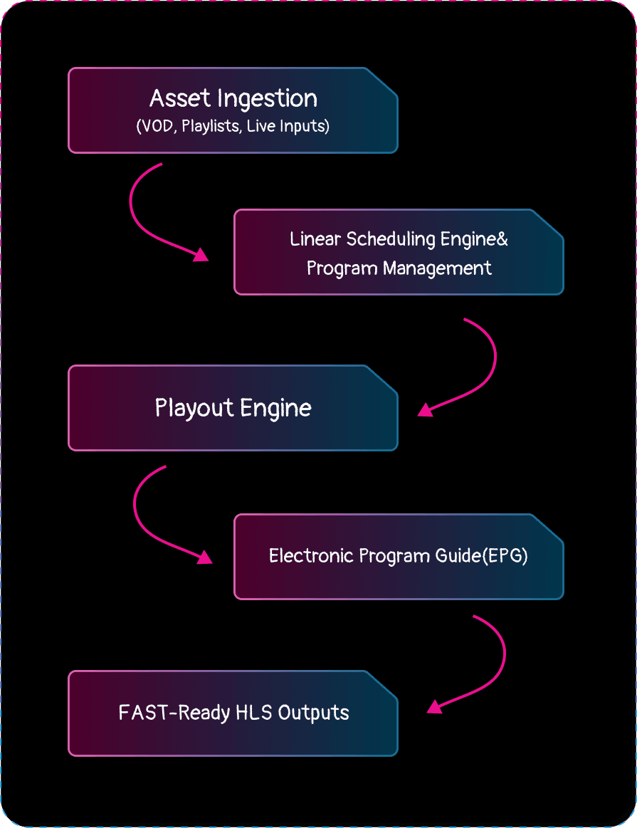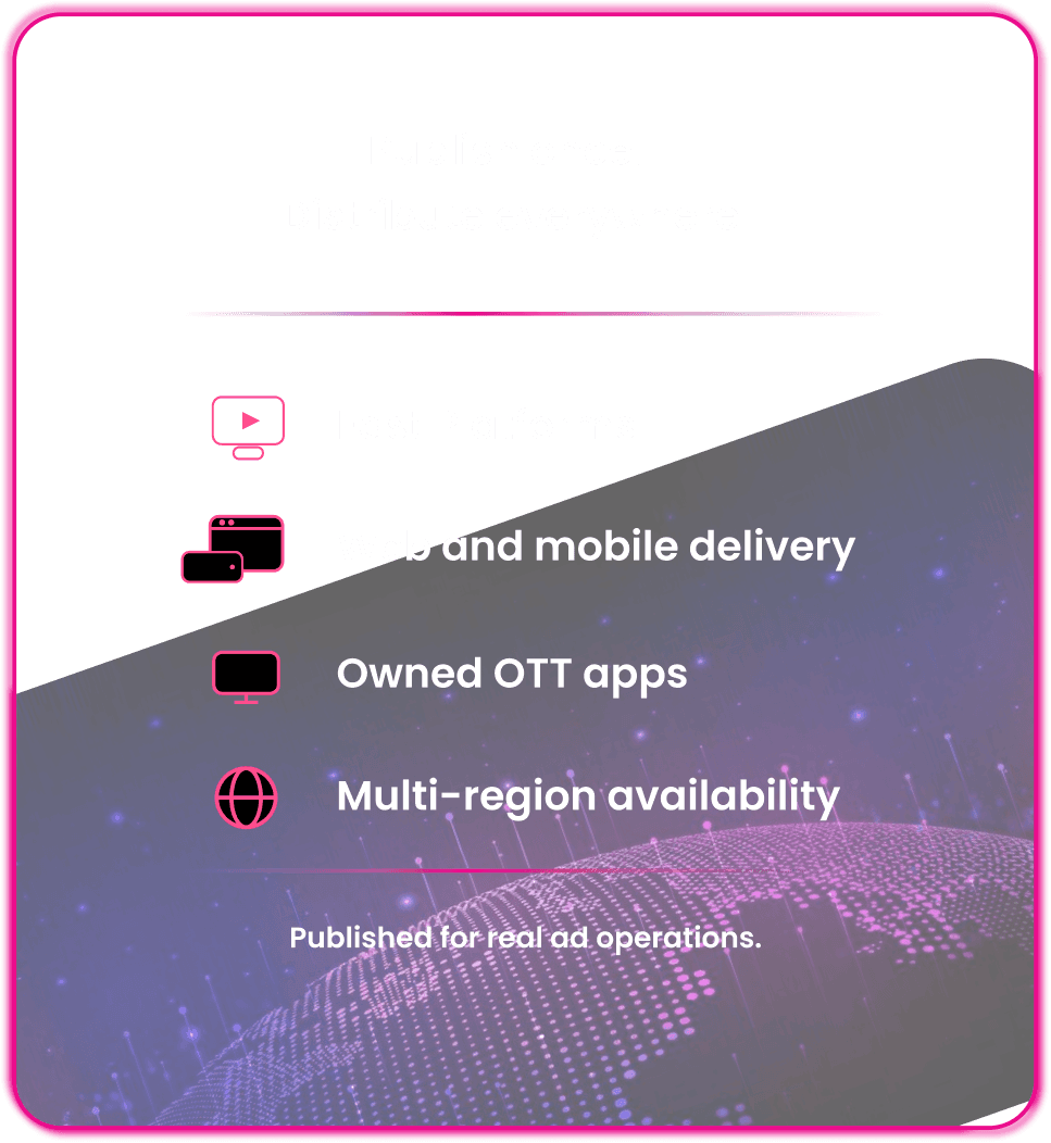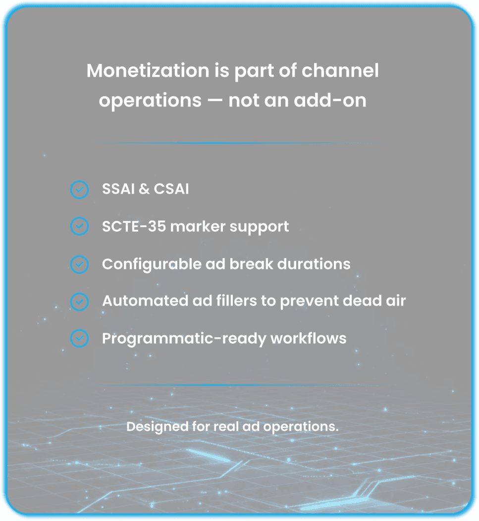 Create, schedule, distribute, and monetize 24/7 FAST channels from one AI-native playout system - no fragile integrations, no third-party dependencies, no compromise on uptime or revenue.
